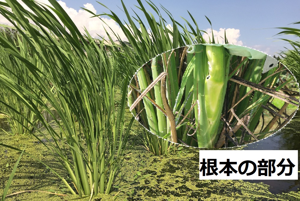 背丈は約2~2.5mまで成長します。まこもに黒穂菌がつき、膨らんで太くなった部分を「まこもたけ」と呼び、9月下旬から10月にかけて食用として収穫されます。